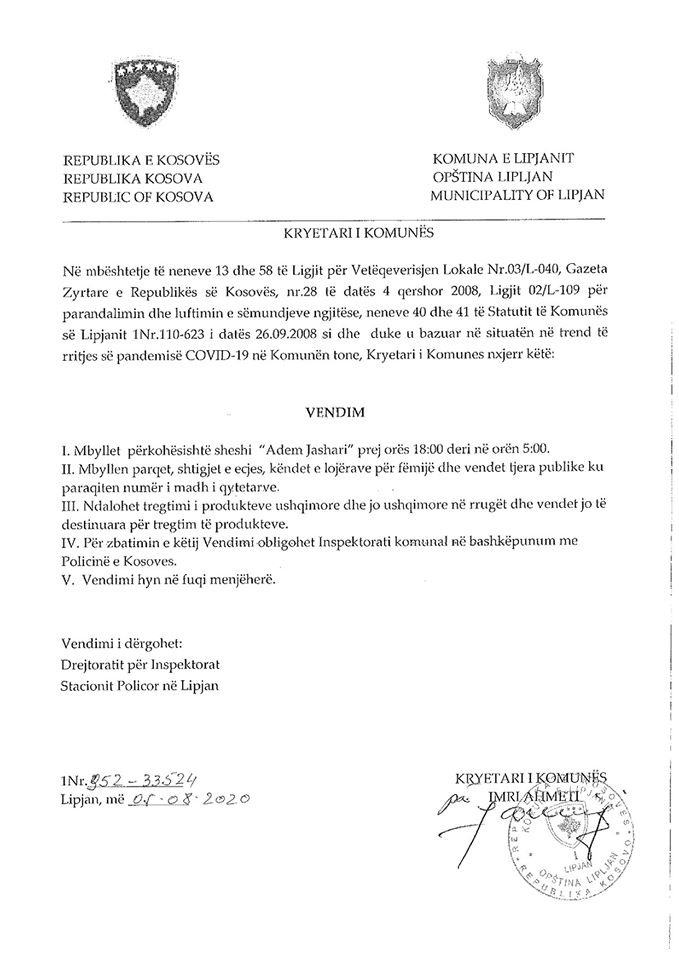Kryetari i komunës së Lipjanit, Imri Ahmeti ka marr vendim për mbylljen e përkohshme të shesheve dhe parqeve për shkak të situatës së krijuar pas rasteve të fundit me COVID-19 në këtë komunë.