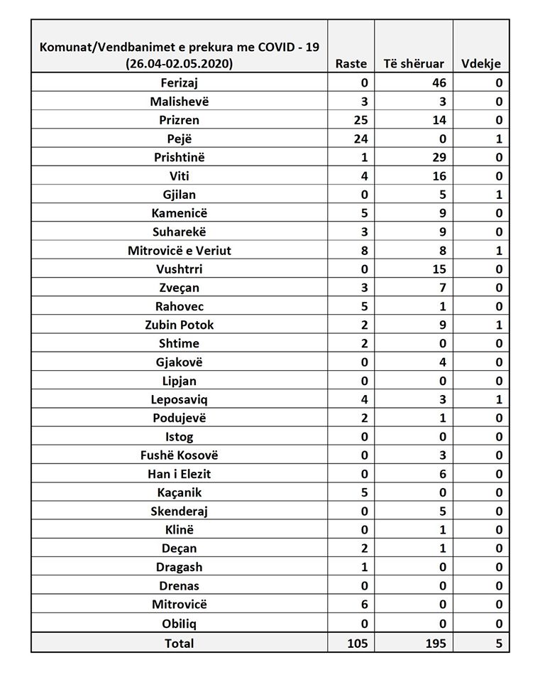 “Sot më 03 maj 2020, janë testuar gjithsej 171 mostra të marra nga Klinika Infektive dhe gjurmimi i kontakteve të rasteve në terren, prej të cilave me SARS-CoV-2, janë diagnostikuar gjithsej 11 raste. Rastet pozitive janë raste kontakti nga: komuna e Mitrovicës së Jugut 5 raste (sipas vendbanimit: 5 raste Rekë) nga komuna e Prizrenit 3 raste (sipas vendbanimit: 3 raste Prizren), Leposaviq 3 raste (sipas vendbanimit: Leposaviq 2 raste, Leshak 1)”, thuhet në njoftim.
