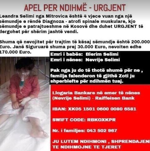 Leandra Selimi, ka nevojë që urgjent të dërgohet për shërim jashtë vendit.