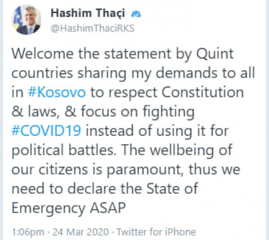 Përmes një cicërime në Twitter, presidenti Thaçi ka thënë se e mirëpret komunikatën e QUINT-it për respektimin e Kushtetutës, ligjeve dhe fokusimit në luftën kundër koronavirusit, por gjithashtu, ka bërë thirrje për shpalljen e gjendjes së jashtëzakonshme, e më pas, e ka ndryshuar cicërimën në Twitter.
