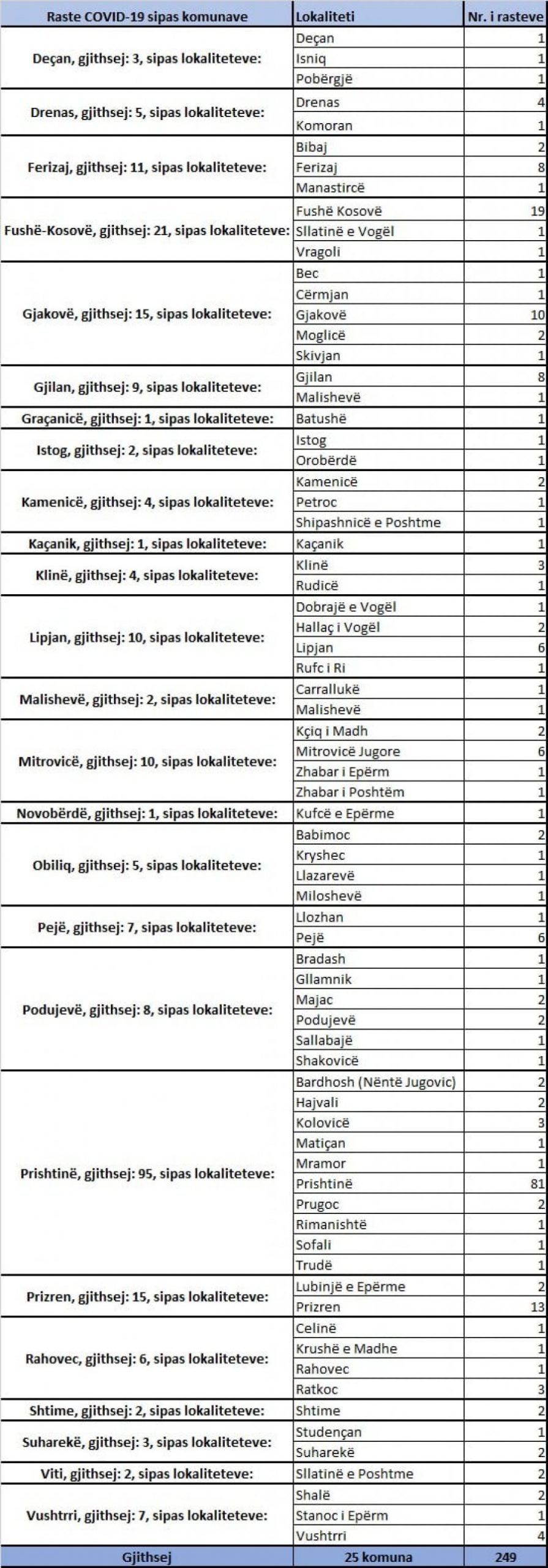 Në 24 orët e fundit janë regjistruar edhe 249 raste pozitive nga testimi i 2291 mostrave. Janë shëruar 274 persona.