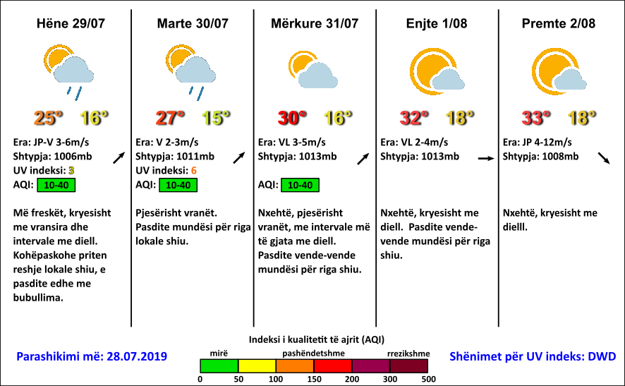 28.07.2019 – Një vorbull ciklonike nga Atlantiku që do të depërtojë mbi rajon sonte dhe ditës së nesërme, do të kushtëzojë në vendin tonë mot më të freskët dhe të paqëndrueshëm, me reshje lokale shiu.