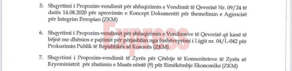 Gazeta Express mëson nga burime të sigurta brenda Qeverisë së Kosovës se në mbledhje do të diskutohen 16 pika të ndryshme, por pika numër 5 do të shqyrtojë një propozim-vendim me anë të të cilit mund të shtohet një ministri e re.