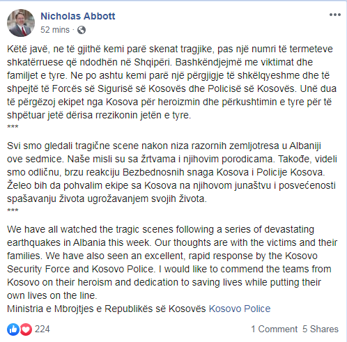 “Këtë javë, ne të gjithë kemi parë skenat tragjike, pas një numri të tërmeteve shkatërruese që ndodhën në Shqipëri. Bashkëndjejmë me viktimat dhe familjet e tyre. Ne po ashtu kemi parë një përgjigje të shkëlqyeshme dhe të shpejtë të Forcës së Sigurisë së Kosovës dhe Policisë së Kosovës. Unë dua të përgëzoj ekipet nga Kosova për heroizmin dhe përkushtimin e tyre për të shpëtuar jetë derisa rrezikonin jetën e tyre”, tha ambasadori britanik.