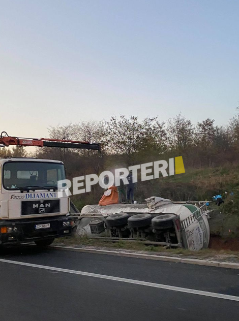 Një mikser i betonit është rrokullisur derisa ishte duke qarkulluar në rrugë.