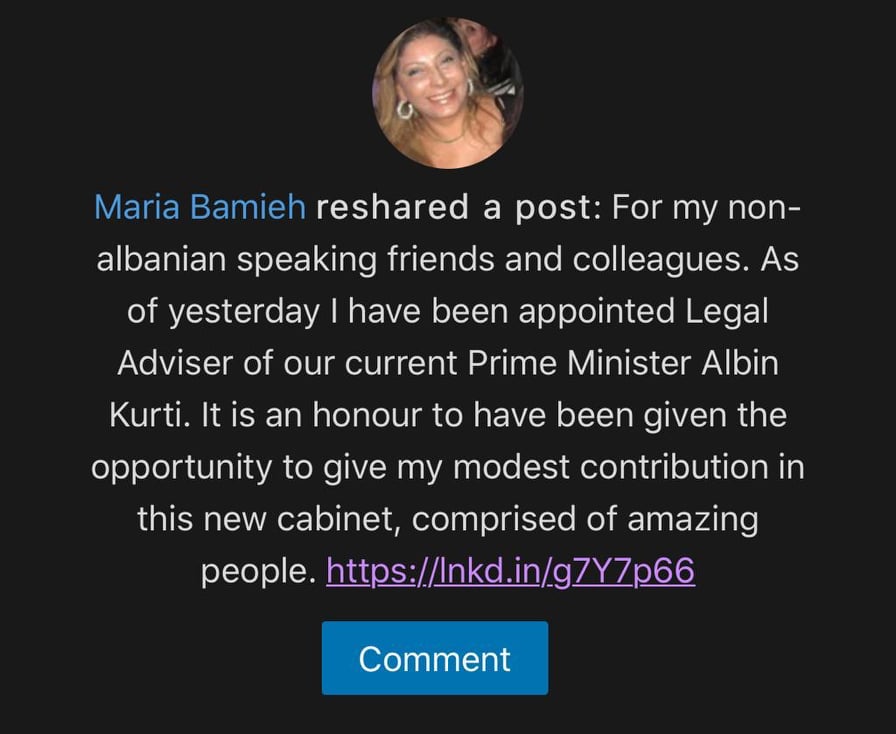 “Për shok e mi jo shqifolës dhe kolegët më duhet t’iu njoftoj se që nga dje jam emëruar në kabinetin e Kryeministrit aktual Albin Kurti. Jam shumë e lumtur për këtë mundësi të ofruar për të dhënë kontributin tim modest në një grup të përbërë me njerëz të mrekullueshëm” shkruan ajo.