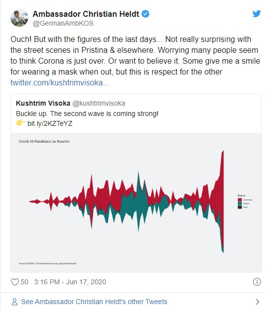 Ai përmes një publikimi në Twitter ka thënë se lëvizja e qytetarëve në Prishtinë e gjithandej në Kosovë është befasuese krahasuar me shifrat e konfirmuara së fundmi me COVID-19.“Ouch! Por me shifrat e ditëve të fundit … Jo vërtet befasuese me skenat rrugore në Prishtinë dhe gjetkë. Duke shqetësuese që shumë njerëz mendojnë që Corona ka përfunduar. Ose dëshironi ta besoni. Disa më japin një buzëqeshje për veshjen e maskës kur jam jashtë, por ky është respekti për tjetrin”, ka shkruar Heldt.