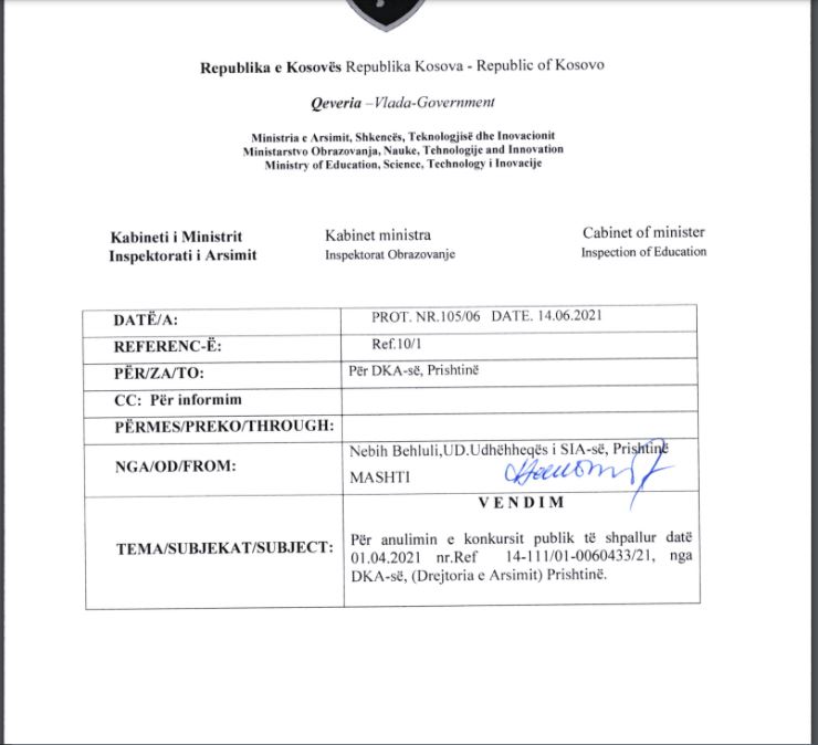 Inspektorati i Ministrisë së Arsimit, Shkencës, Teknologjisë dhe Inovacionit ka anuluar konkursin e Komunës së Prishtinës për për drejtorë e zëvendësdrejtorë në shkollat e kryeqytetit.
