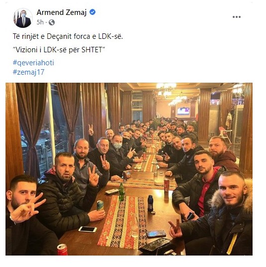“Të rinjët e Deçanit forca e LDK-së. “Vizioni i LDK-së për SHTET” #qeveriahoti #zemaj17”, ka shkruar ai sipër fotos.
