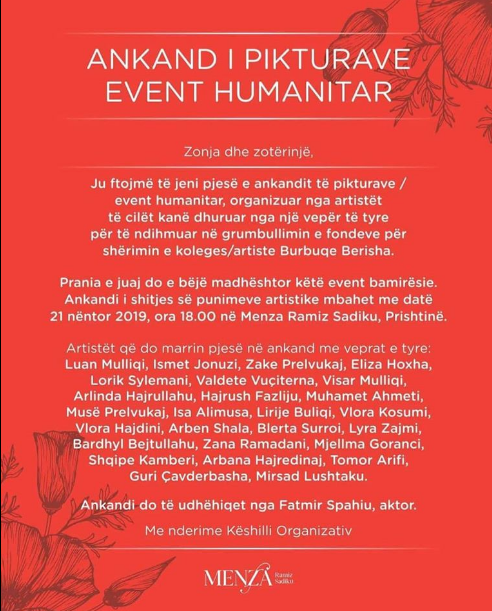 Komuniteti artistik me nderimet më të larta fton të gjithë që kanë mundësi dhe dëshirë për një vepër arti të jeni të pranishëm në ankand dhe në të njëjtën kohë të kontribuojnë në grumbullimin e fondeve.