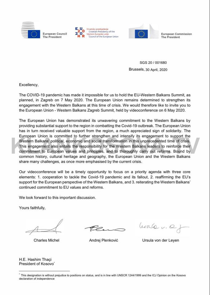 Bashkimi Europian i ka dërguar ftesë presidentit Hashim Thaçi për pjesëmarrje në Samitin e Zagrebit që do të mbahet nesër përmes një video-konference.
