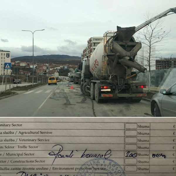 Drejtori i Inspeksionit, Adonis Tahiri, përmes një postimi në Facebook, ka treguar se kanë shqiptuar gjobën prej 200 eurosh për shoferin e një betoniere.