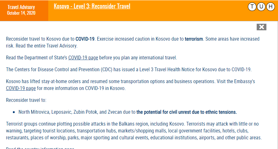 Departamenti i Shtetit këshilloi amerikanët të rishikojnë udhëtimet në Kosovë për shkak të koronavirusit dhe të tregojnë kujdes nga rreziku i terrorizmit në disa zona ku ai është rritur.