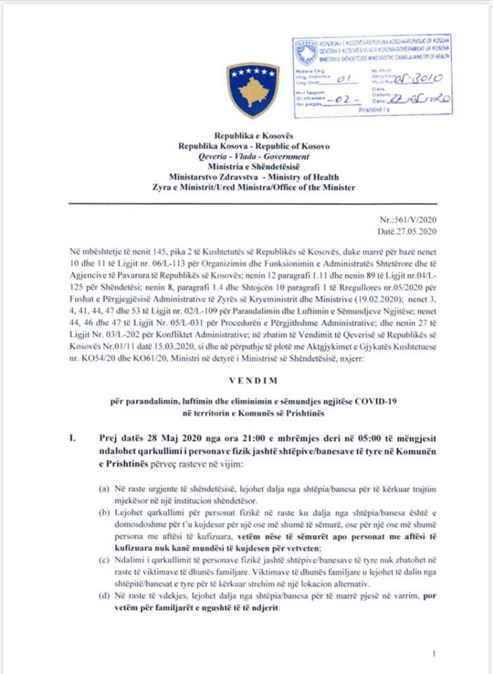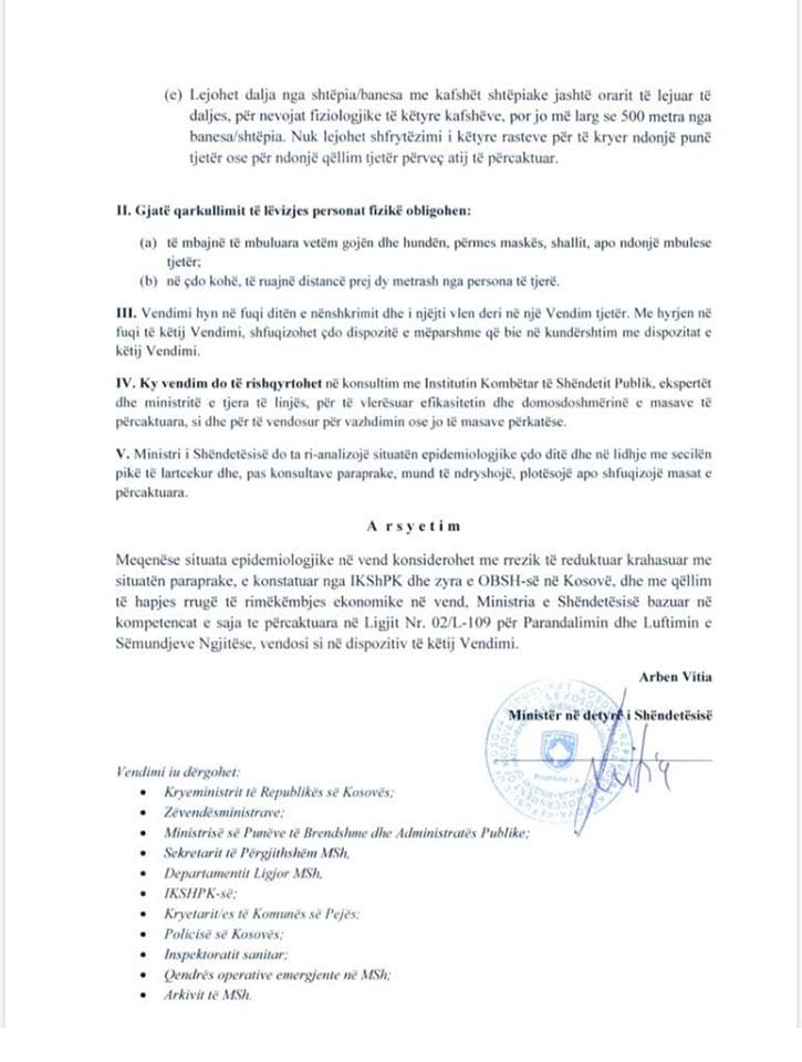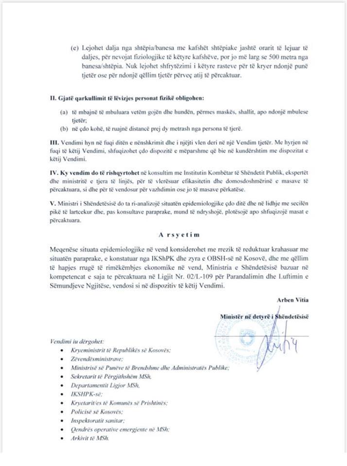 Sipas këtij vendimi prej datës 28.05.2020 nga ora 21:00 e mbrëmjes deri në 05:00 të mëngjesit ndalohet qarkullimi i personave fizik jashtë shtëpive/banesave të tyre përveç rasteve në vijim: