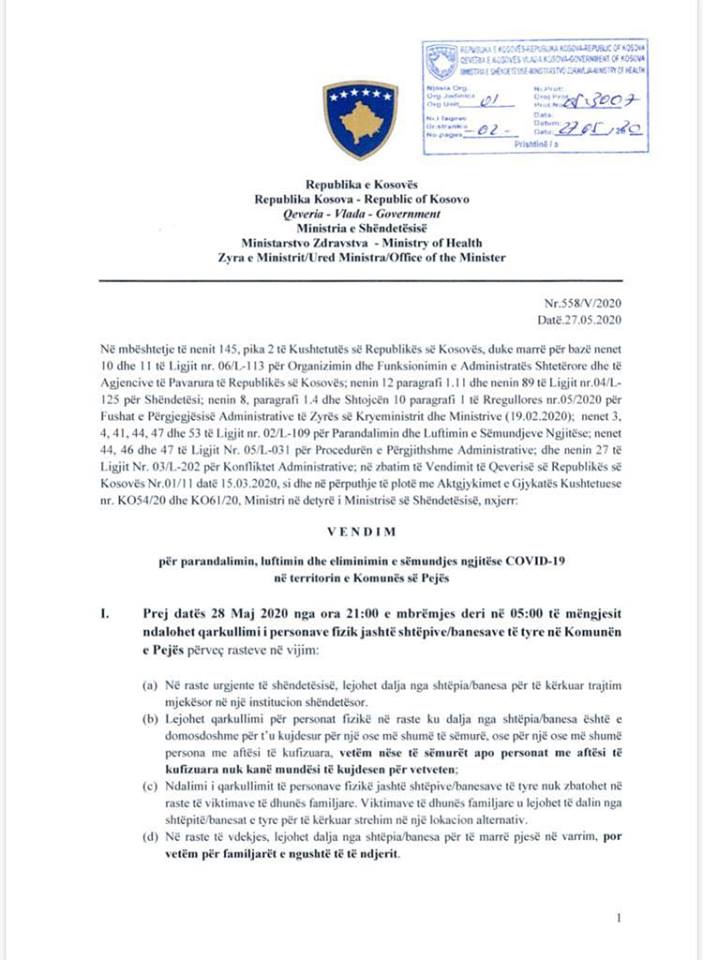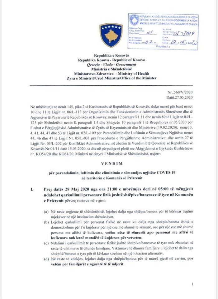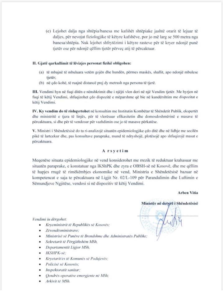IndekSonline posedon këtë vendim të MSH-së, i njëjti është nxjerrë dje 27.05.2020, ndërsa do të hy në fuqi që nga sot dhe vlen për tërë territorin e Republikës së Kosovës.