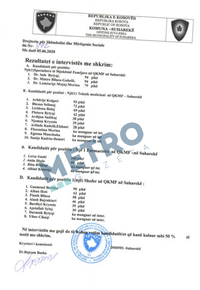 Drejtoria ka publikuar dje rezultatet e intervistës me shkrim për kandidatët të cilët kanë aplikuar dhe në pozitën e specialistes së Mjekësisë Familjare, Sale Bytyqi ka dalë e para në listë duke plotësuar testin rreth 95 % të tij.
