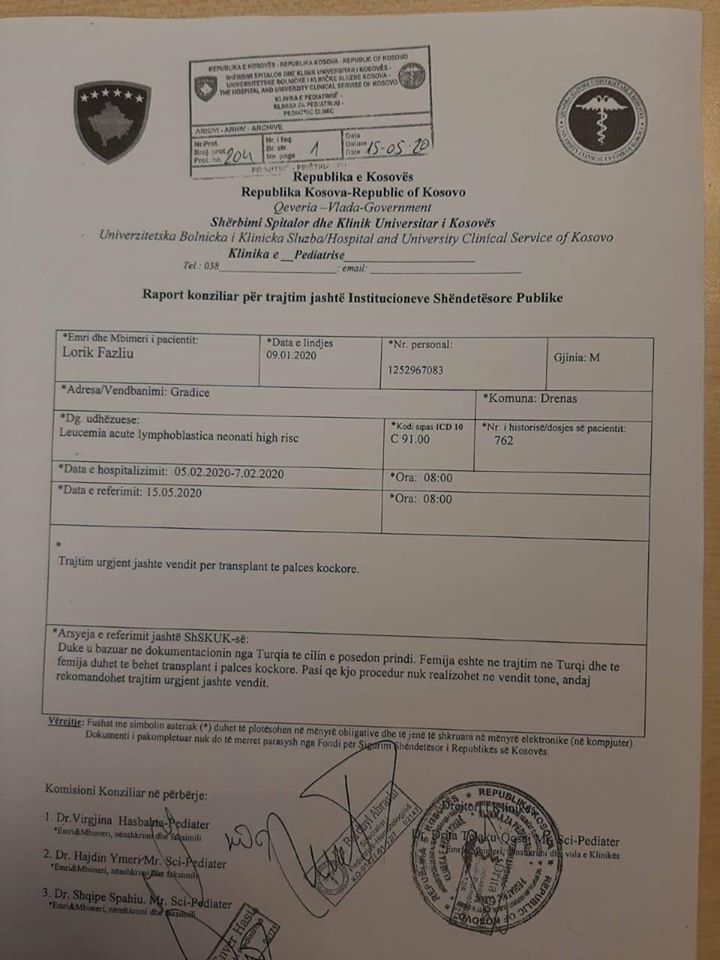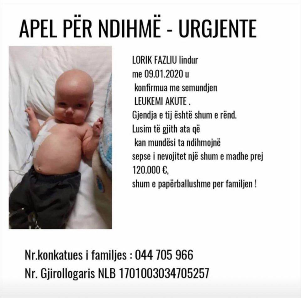 Lorik Fazliu nga komuna e Drenasit i lindur më 9 janar të këtij viti është diagnostikuar me Leukemi Akute.
