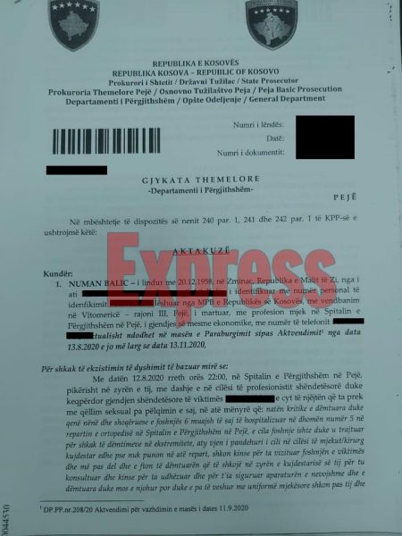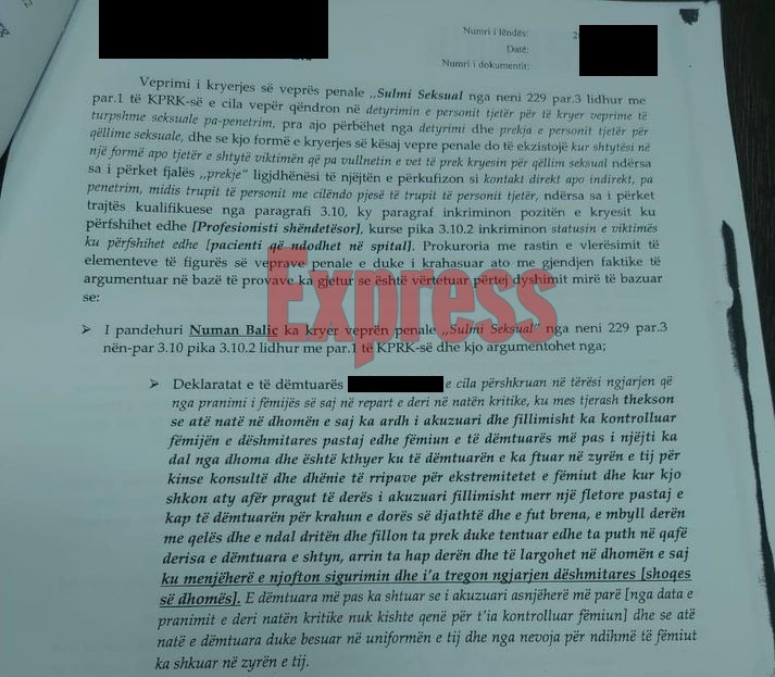 Ish-ministri i Shëndetësisë, Numan Baliq, po akuzohet se ka ngacmuar seksualisht një grua në vendin e tij të punës, në Spitalin e Përgjithshëm në Pejë. Në natën e 12 gushtit të këtij viti, 23-vjeçarja po qëndronte në spital me vajzën e saj 6 muajsh, e cila kishte komplikime shëndetësore. Gazeta Express ka siguruar aktakuzën e ngritur nga Prokuroria Themelore e Pejës në të cilën gjendet të gjitha detajet se si ka ndodhur rasti.