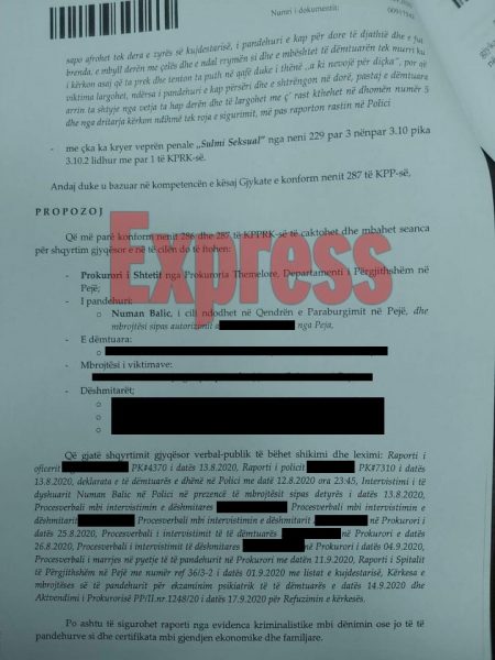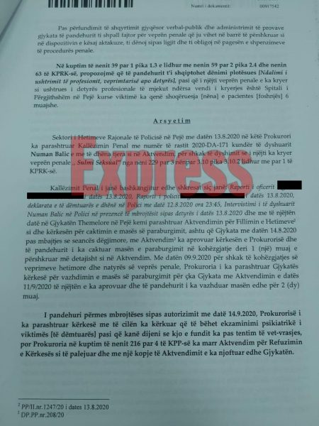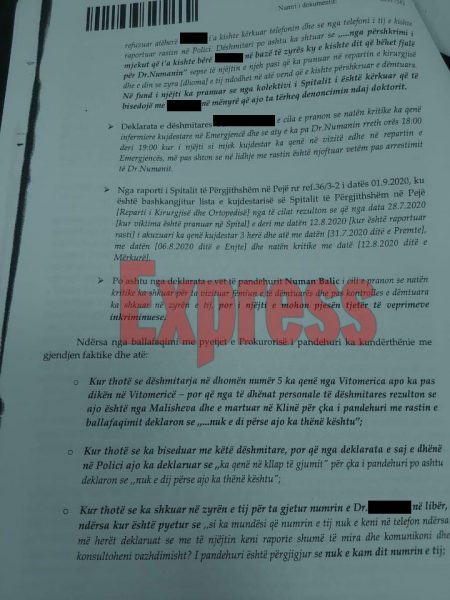 “Më kapi dorën e djathtë në krah dhe më futi brenda. E mbylli derën me çelës dhe e ndali dritën. Tentoi të më puthë me zor e të më prekë me duar edhe në shpinë, por nuk arriti sepse nuk e lejoja duke e shtyrë. Kur i kërkova ta hapë derën, sepse do ta thërras sigurimin, më tha “vetëm po dua me ta matë pulsin”, është dëshmia e viktimës për natën kur u sulmua nga mjeku Numan Baliq në Spitalin e Pejës.