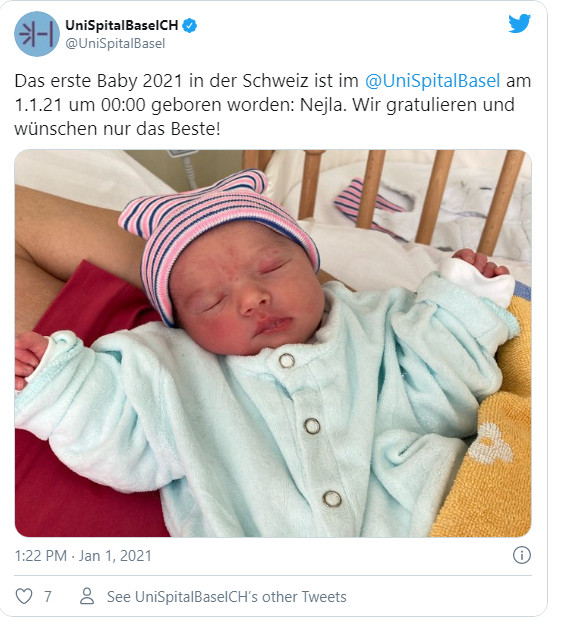 Foshnja e parë e vitit 2021 në Zvicër lindi më 1 janar 2021 në 00:00 në Spitalin Universitar të Bazelit.