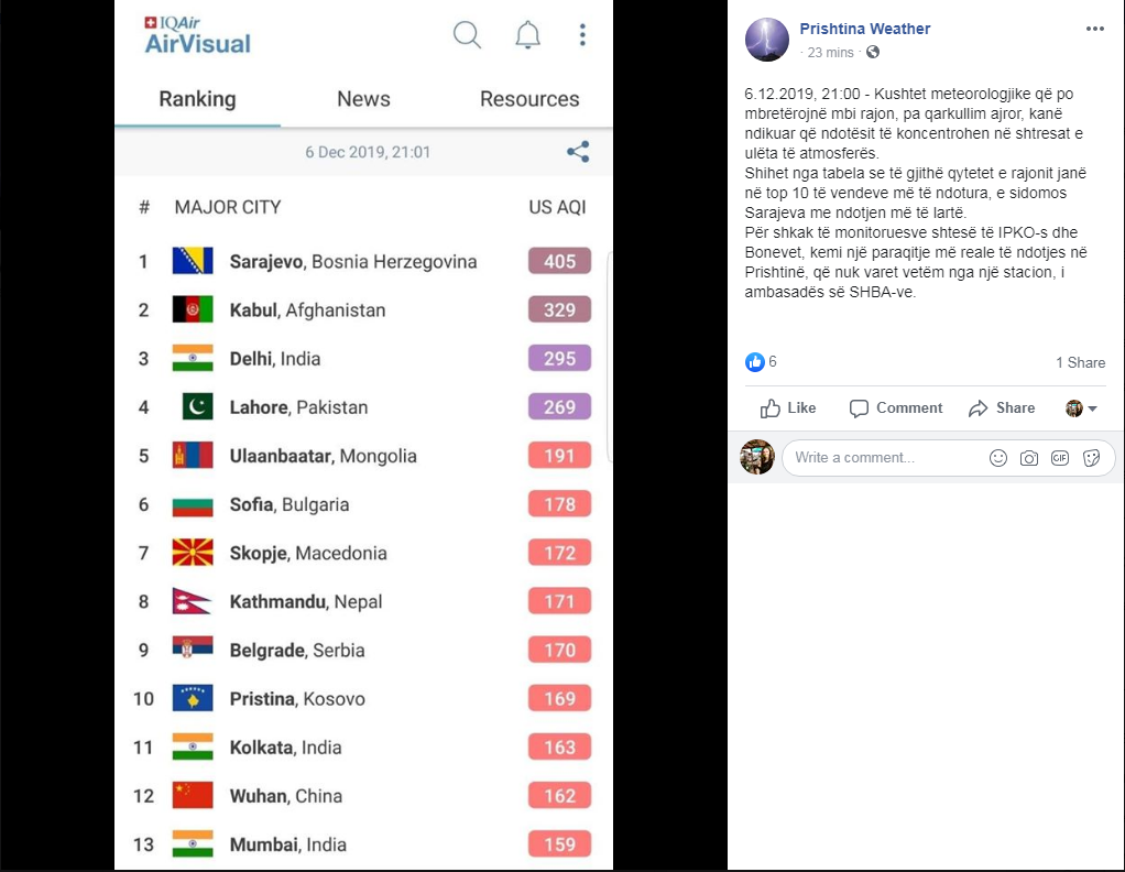 Sipas një foto të publikuar nga ‘Prishtina Weather’, kryeqyteti i Kosovës sot është një ndër dhjetë qytetet më të ndotura në botë.
