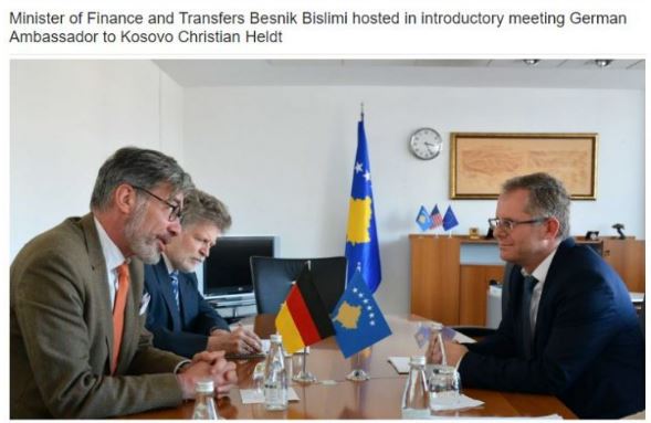 Në takimin e parë që Besnik Bislimi pati si ministër me Ambasadorin gjerman në Kosovë, Christian Heldt fotografia e Hashim Thaçit nuk duket askund.