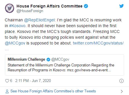 Kryetari i Komisionit për Punë të Jashtme në Dhomën e Përfaqësuesve të Shteteve të Bashkuara të Amerikës, Eliot Engel, i është gëzuar lajmit që MCC zhbllokoi ndihmën amerikane për Kosovën.