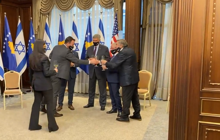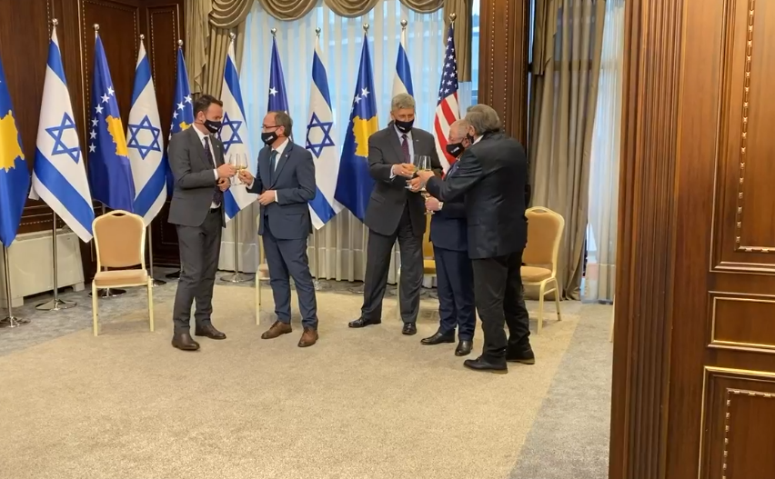 Pas ceremonisë virtuale, në një ambient me flamuj të Kosovës dhe Izraelit, por edhe flamurin e SHBA-së, janë parë duke festuar kryeministri në detyrë, Avdullah Hoti, ambasadori amerikan, Philip Kosnett, ministrja në detyrë e Punëve të Jashtme, Meliza Haradinaj-Stublla dhe Faton Peci, këshilltari i ushtrueses së detyrës së presidentes, Vjosa Osmani. Ndonëse me një sërë mosmarrëveshjes dhe me shumë kundërshti mes tyre, Hoti dhe Peci që jo shumë kohë më parë ishin bashkëpartiakë, i kanë cakrruar gotat dhe e kanë uruar njëri-tjetrin për këtë sukses, raporton Gazeta Express.