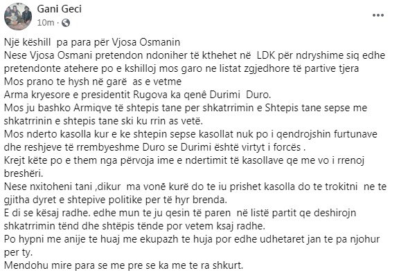 “Nëse Vjosa Osmani pretendon ndonjëherë të kthehet në LDK për ndryshime siç edhe pretendonte; atëherë po e këshilloj: Mos garo në listat zgjedhore të partive tjera. Mos prano të hysh në garë as e vetme”.