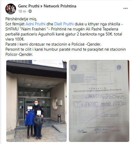 “Sot fëmijët Adni Pruthi dhe Diell Pruthi duke u kthyer nga shkolla -SHFMU “Naim Frashëri “- Prishtinë ne rrugën Ali Pashë Tepelena përballë pastiçerisë Agusholli kanë gjetur 2 banknota nga 50€, total vlera 100€. Paratë i kemi dorëzuar ne stacionin e Policisë -Qendër. Personit te cilit i kanë humbur paratë mund te paraqitet në stacionin Policor-Qendër”, ka shkruar ai në grupin “Network Prishtina” në Facebook.