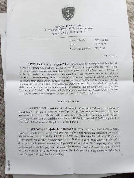 Mirëpo Gjykata Themelore e ktheu në punë Mujajn para dy vjetëve. Kundra këtij vendimi ishte Ministria e Punëve të Brendshme, ku edhe bëri ankesë.