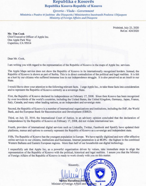 Haradinaj- Stublla, i ka shkruar letër zyrtare drejtorit ekzekutiv të kompanisë Apple, Tim Cook. Ajo ka kërkuar që të marrin hapa për të paraqitur saktë kufijtë e Kosovës në hartë.