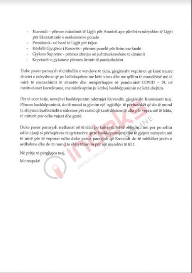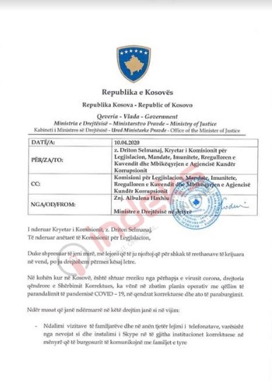 Përmes një letre të drejtuar në Komisionin për Legjislacion, të cilin e ka siguruar Indeksonline, Haxhiu ka kërkuar që gjatë seancës së Kuvendit e cila mbahet të martën, saktësisht nesër të shqyrtohen mundësitë dhe të gjendet një zgjidhje e përbashkët në të mirë të një pjese të shoqërisë të cilët janë të privuar nga liria gjatë gjendjes emergjente.