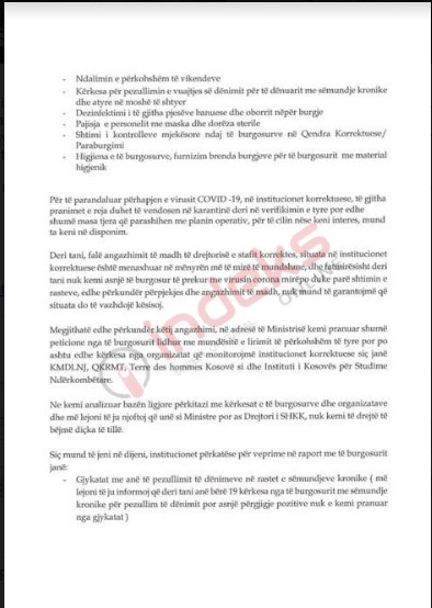 Ndër të tjerash thuhet se në ministrinë e Drejtësisë janë pranuar shumë peticione nga të burgosurit lidhur më mundësinë e lirimit të përkohshëm të tyre, por poashtu edhe kërkesa nga organizatat që monitorojnë institucionet korrektueses siç janë KMDLNJ, QKRMT et ë tjera.