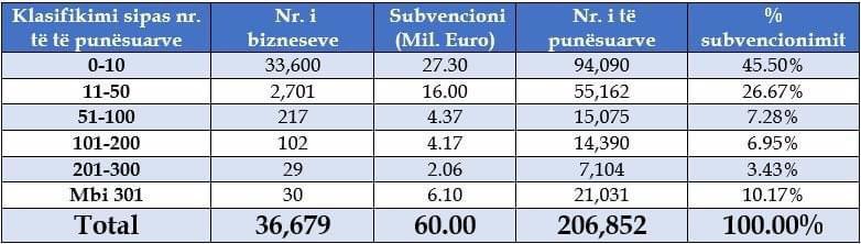 Struktura e bizneseve përfituese siç është prezantuar në tabelë, tregon që përmes kësaj mase më së shumti përfitojnë bizneset e vogla të cilat punësojnë prej 1 deri në 50 punonjës.