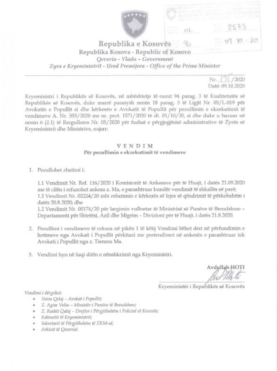 “Kryeministri i Qeverisë së Republikës së Kosovës, Avdullah Hoti, bazuar në fushat e përgjegjësisë administrative të Zyrës së Kryeministrit dhe Ministrive, ka marrë vendim për pezullimin e ekzekutimit të vendimeve A. Nr. 555/2020 me nr. prot A. nr. 1571/2020, të datës 01.10.2020, sipas kërkesës nga Avokati i Popullit”, thuhet në komunikatë.