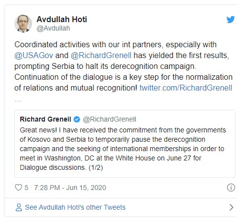“Aktivitetet e koordinuara me partnerët tanë, veçanërisht me Qeverinë e SHBA-së dhe Richard Grenellin, ka dhënë rezultatet e para, duke bërë që Serbia të ndalojë fushatën e saj të çnjohjeve. Vazhdimi i dialogut është hap kyç për normalizimin e marrëdhënieve dhe njohjen reciproke”, ka shkruar Hoti.