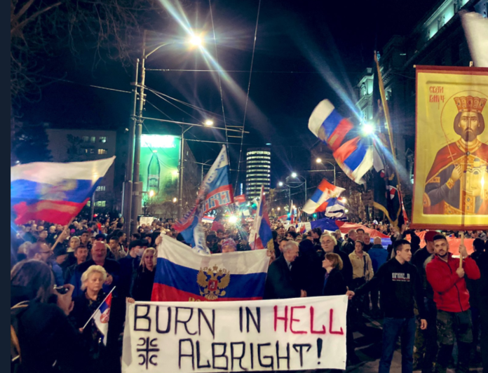 Serbët me flamuj të Rusisë dhe me disa parulla ‘Albright digju në ferr’ dolën për të festuar në rrugët e kryeqytetit serb.