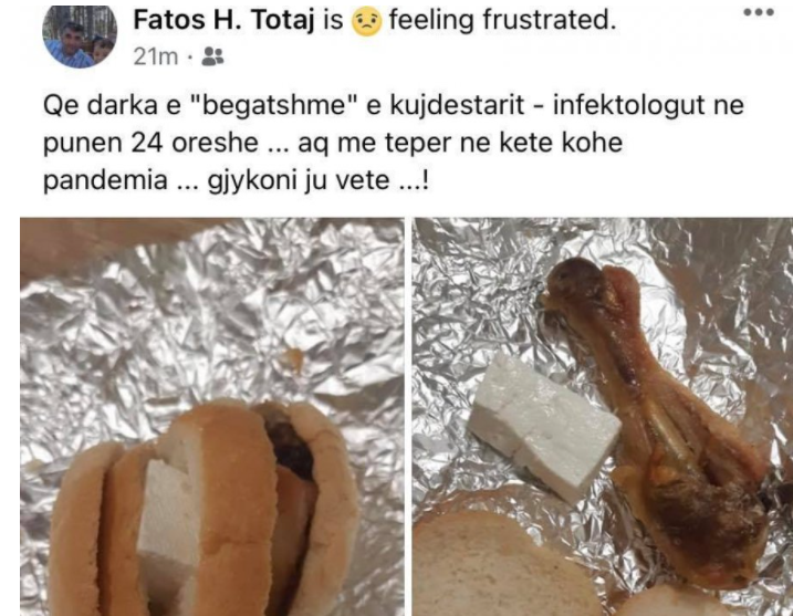 “Qe darka e “begatshme” e kujdestarit – infektologut në punën 24 orëshe … aq më tepër në këtë kohë pandemie … gjykoni ju vetë …!”, shkruan ai.