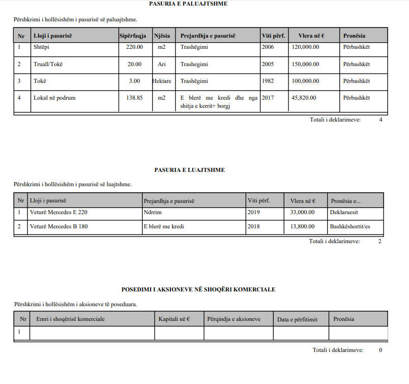 Haxhiu, po ashtu ka deklaruar se vozitë një veturë gjermane Mercedes, të tipit E Class 22o, me vlerë 33 mijë euro.