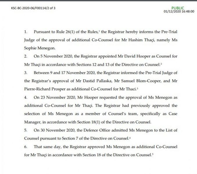 Dhomat e Specializuara kanë publikuar të martën në mbrëmje dokumentin për aprovimin e avokatëve shtesë për Thaçin.
