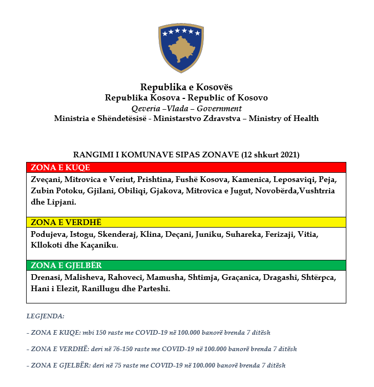 Ministria e Shëndetësisë ka bërë rangimin e ri të komunave sipas zonave bazuar në rezultatet e IKSHPK-së, përkatësisht numrin e rasteve të reja të COVID-19 në 100.000 banorë në intervalin kohor prej shtatë ditësh.