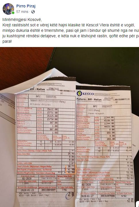 “Fatura në të majtë, njëjtë sikurse tek ajo në të djathtë, borxhi ka qenë 0, mirëpo në faturën në të majtë pagesa në fund është 3,21 euro më shumë se shuma e cila do të duhej të paguhej!. Pra, në vend se totali për pagesë të ishte 38,77 sepse aq është realisht, është 41,98 euro, për 3,21 euro më shumë, pa asnjë arsye!”, ka shkruar Pirraj.