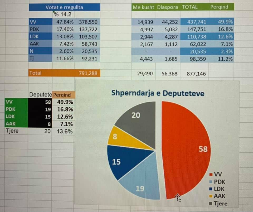 Qendra e Numërimit të Votave ka njoftuar se janë numëruar të gjitha votat e dërguara me postë. Duke marrë parasysh të gjitha votat e numëruara, fituesja e këtyre zgjedhjeve, Lëvizja Vetëvendosja, ka marrë 58 mandate në Kuvendin e Kosovës.