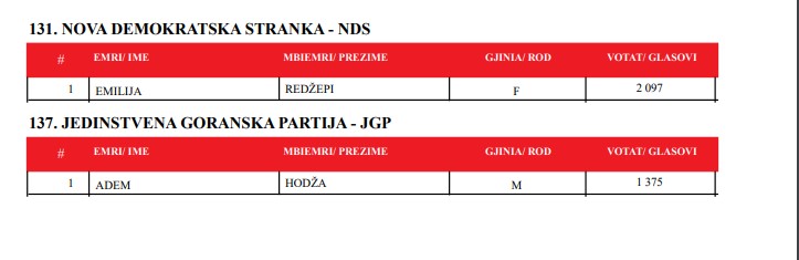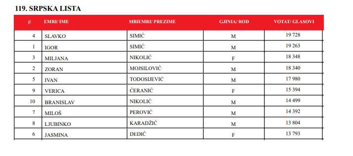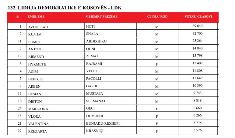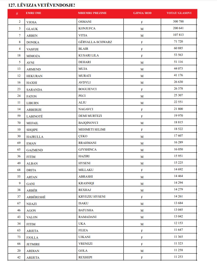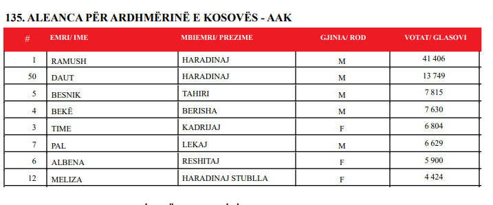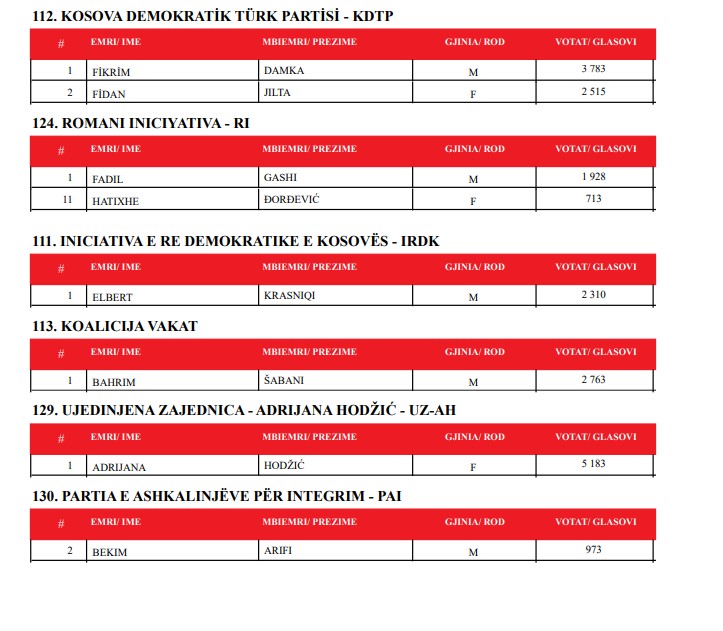 Lëvizja Vetëvendosje prin me 49.95 për qind, Partia Demokratike me 16.9 për qind, Lidhja Demokratike e Kosovës me 12.64 për qind dhe dhe Aleanca për Ardhmërinë e Kosovës me 7.07 për qind.
