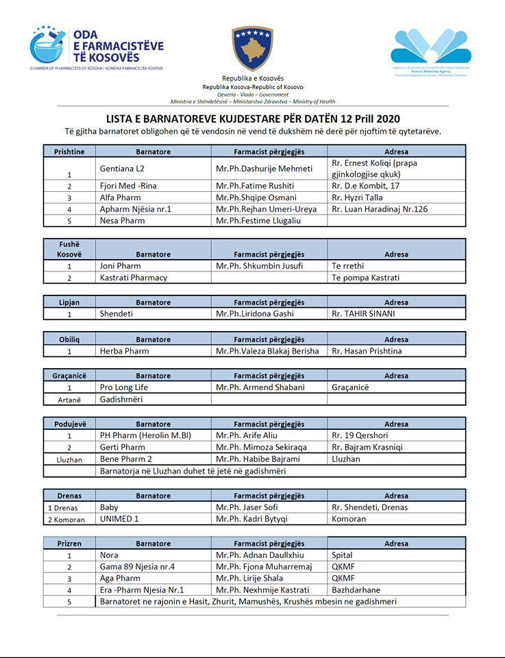 Ministria e Shëndetësisë e ka publikuar listën e barnatoreve kujdestare për sot (12 prill 2020).