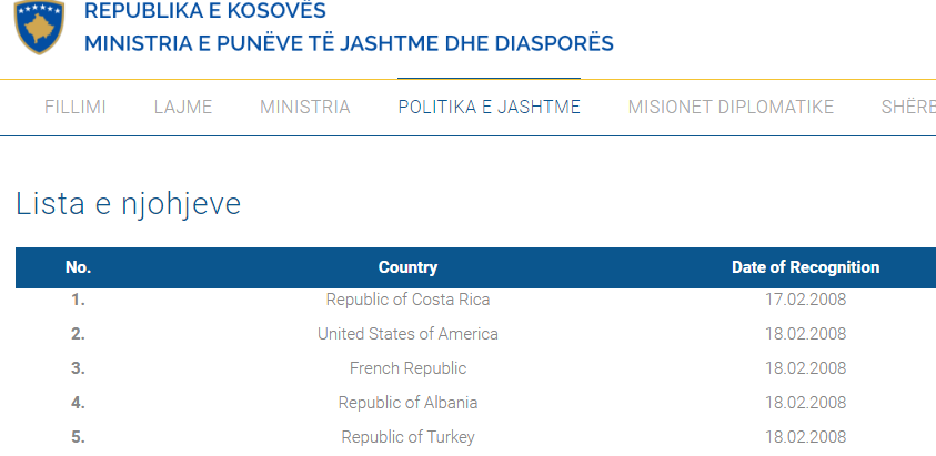 Në listën zyrtare të njohjeve publikuar nga Ministria e Punëve të Jashtme, figurojnë 117 vende të cilat e kanë njohur vendin tonë