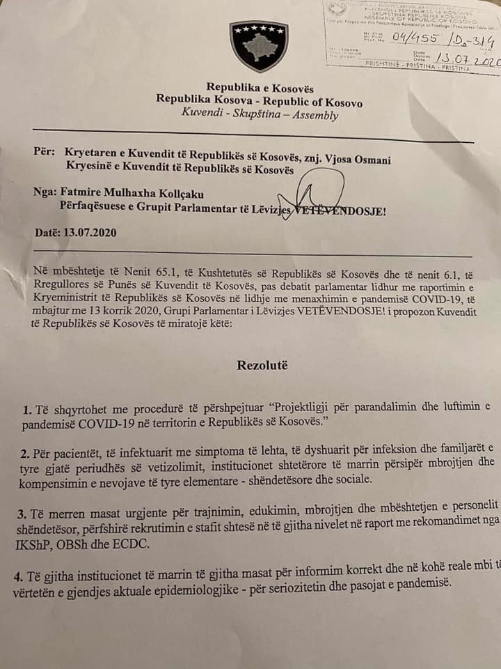 Grupi Parlamentar i Lëvizjes Vetëvendosje, ka propozuar për votim në Kuvend një rezolutë në lidhje me menaxhimin e pandemisë covid-19.