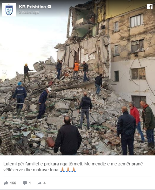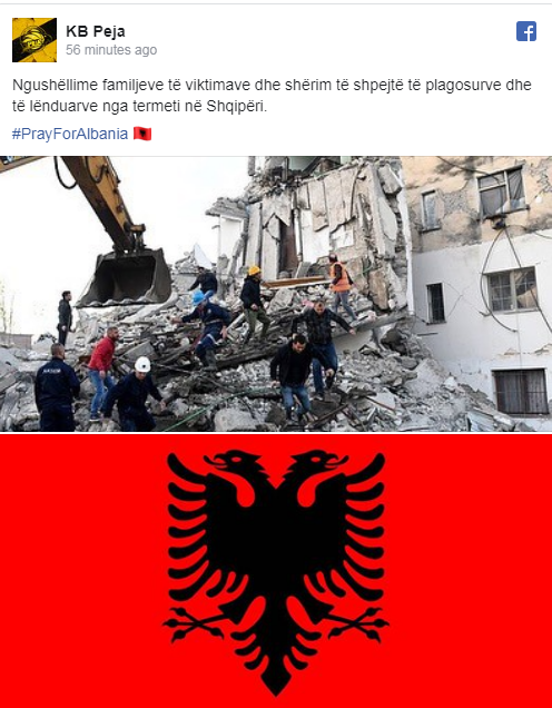 “Ngushëllime familjeve të viktimave dhe shërim të shpejtë të plagosurve dhe të lënduarve në Shqipëri”, thuhet në postimin e KB Pejës.