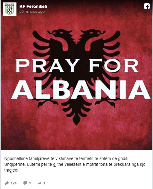 “Ngushëllime familjarëve të viktimave të tërmetit të sotëm që goditi Shqipërinë. Lutemi për të gjithë vëllezërit e motrat tona të prekura nga kjo tragjedi”, shkroi KF Feronikeli.